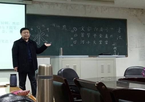报告会上,武永明老师从“汉字书写的意义、楷书笔画书写的艺术和汉字书写的方法”三个方面对汉字笔画和结构做了详细地阐述。武永明老师以楷书为例,研究汉字的笔画和结构书写艺术以及汉字书写的方法。着重介绍了“永”字八法的点、撇、捺以及相应例字的书写,演示了楷书结构艺术中的上下结构和左右结构,最后,强调了汉字书写的原则性方法。