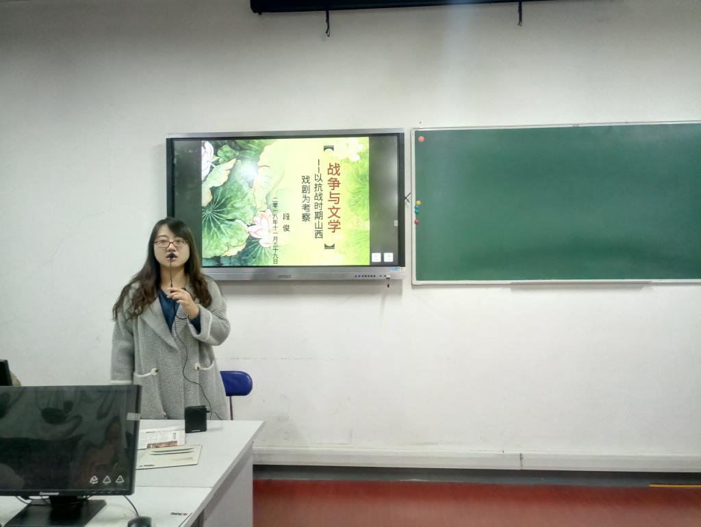 研究生导师段俊副教授在12号楼5层会议室作“战争与文学——以抗战时期山西戏剧为考察”的学术讲座,现当代文学专业的硕士研究生及其他有兴趣的学生听取报告并进行了交流。