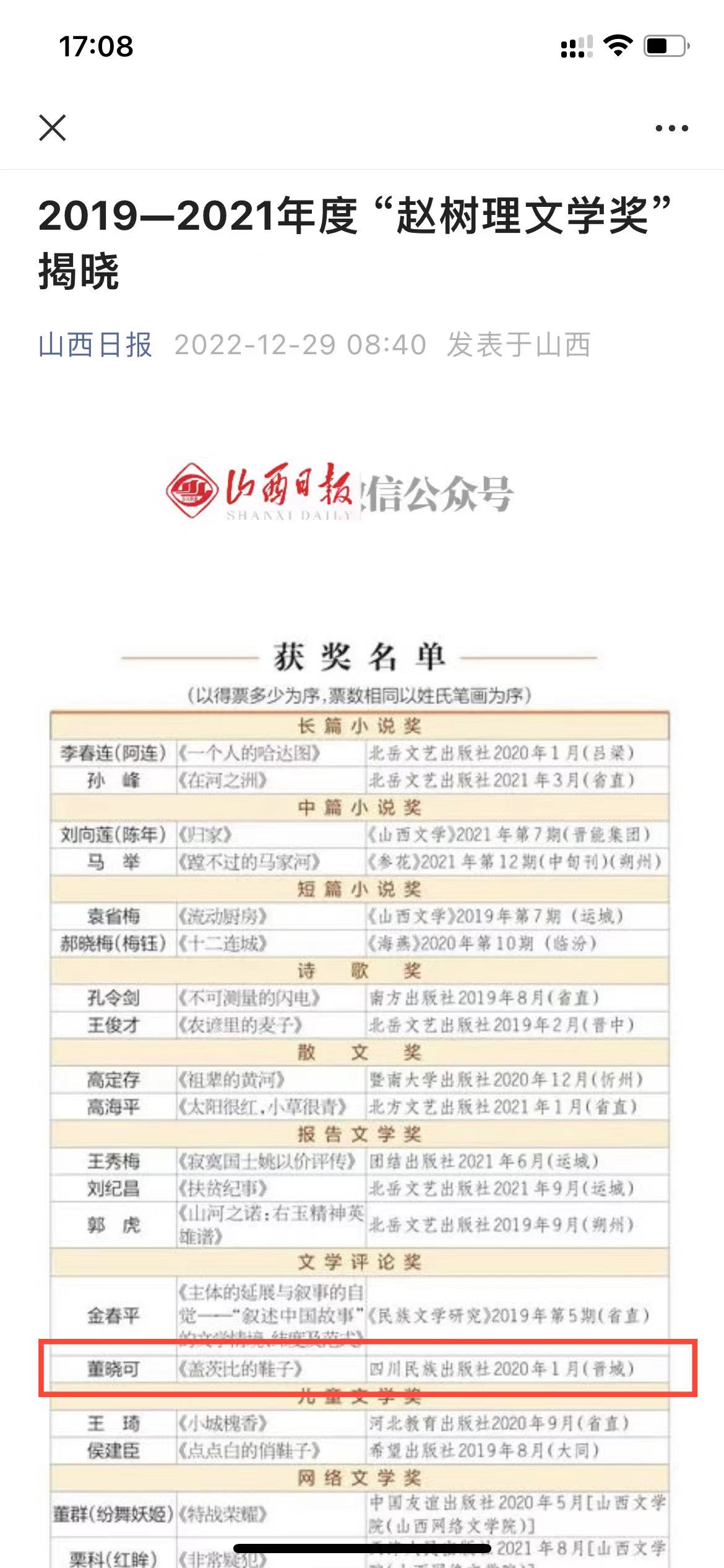 董晓可的《盖茨比的鞋子》获2019-2021年度“赵树理文学奖”文学评论奖。