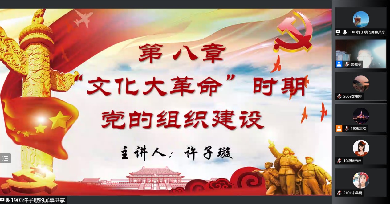 “学雷锋,送温暖”小组学生党支部在腾讯会议召开《中国共产党组织建设一百年》和《一起向未来》专题学习讨论会。会议由支部副书记武振宇主持,支部全体党员和积极分子参加。学生党员许子璇同志担任主讲人。