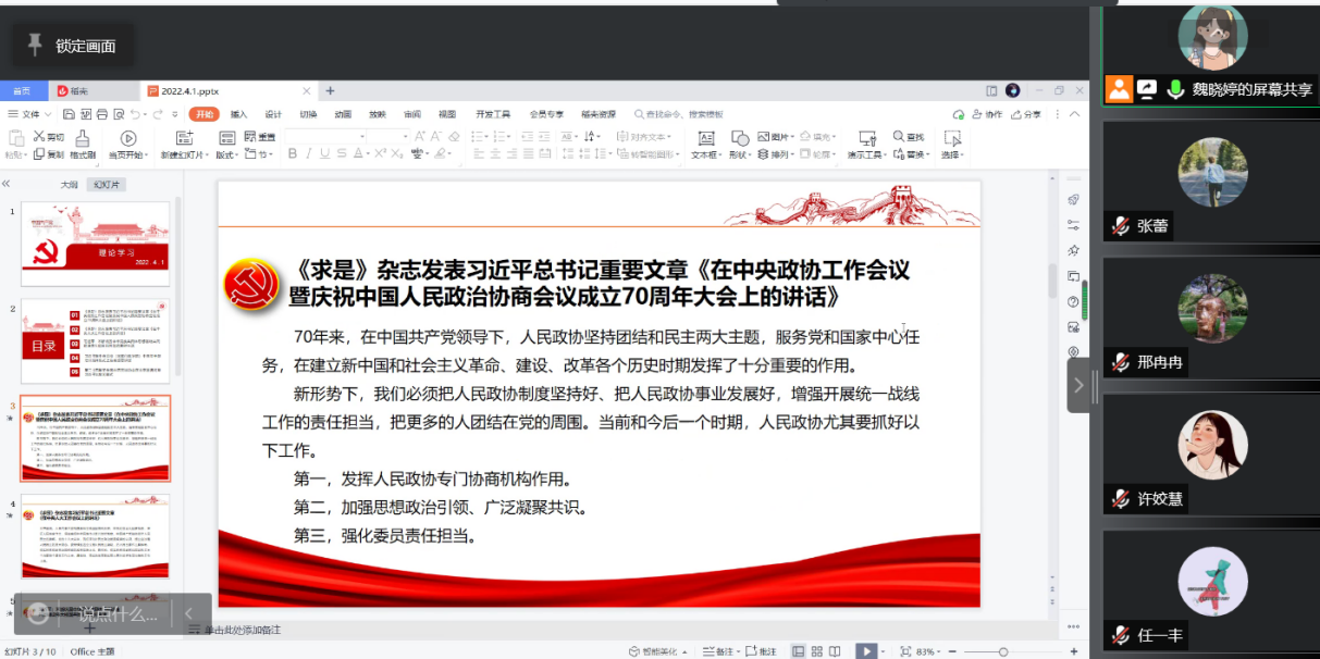 4月1日晚,语言文艺及民俗学研究生党支部以线上会议的形式集体跟学校党委理论学习中心组材料。学习会由纪律检查委员张蕾主持,张慕浩和魏晓婷担任主讲人,支部全体党员参加。