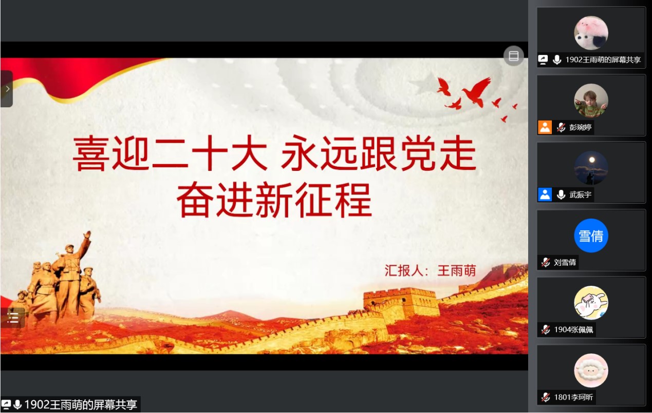 “学雷锋,送温暖”小组学生党支部在腾讯会议开展“喜迎二十大、永远跟党走、奋进新征程”主题党日活动。会议由支部副书记武振宇主持,支部全体党员和积极分子参加。学生党员王雨萌同志担任主讲人。