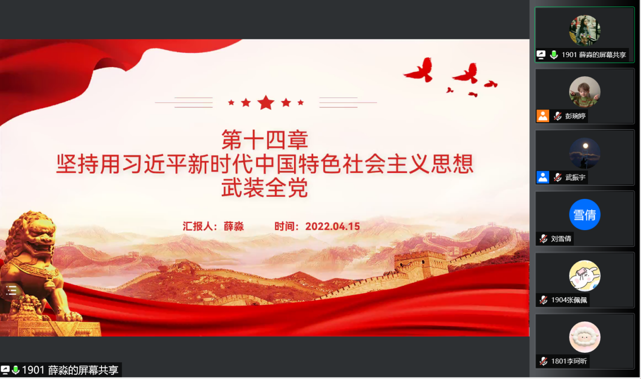 “学雷锋,送温暖”小组学生党支部在腾讯会议学习牢树总体国家安全观与《中国共产党组织建设一百年》第十四章专题。学习活动由支部副书记武振宇主持,支部全体党员和积极分子参加。学生党员薛淼同志担任主讲人。