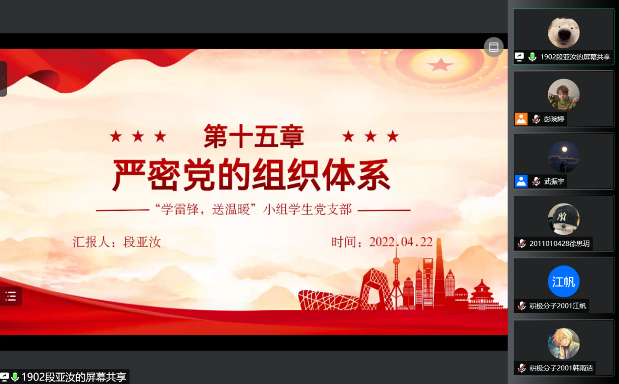 “学雷锋,送温暖”小组学生党支部在腾讯会议学习山西干部在线平台视频与《中国共产党组织建设一百年》第十五章专题学习。活动由支部副书记武振宇主持,支部全体党员和入党积极分子参加。学生党员段亚汝同志担任主讲人。
