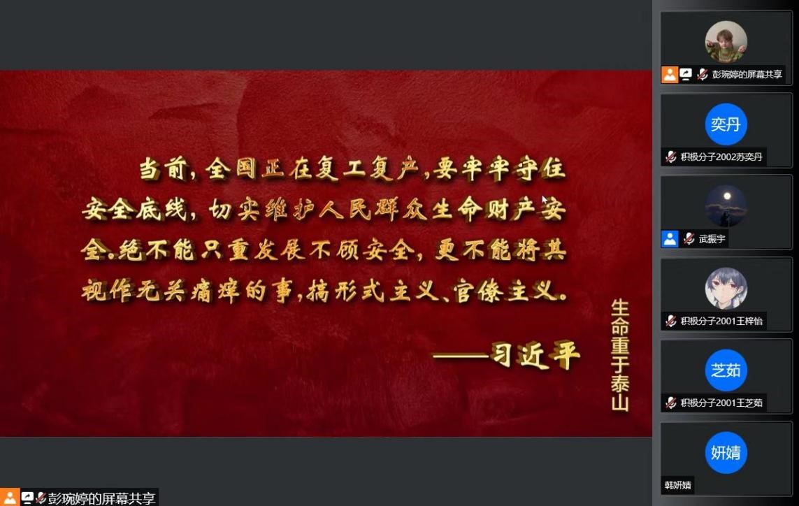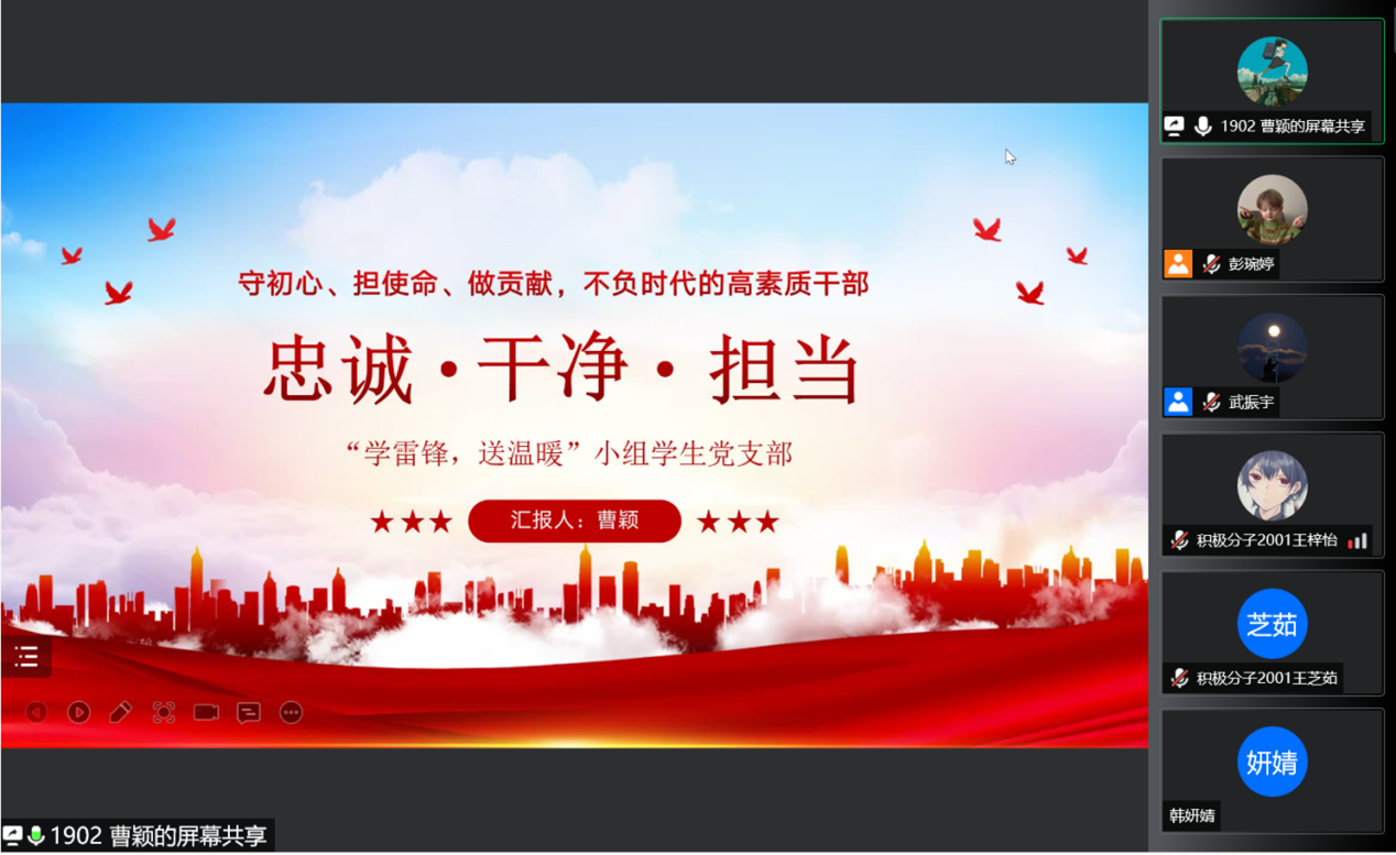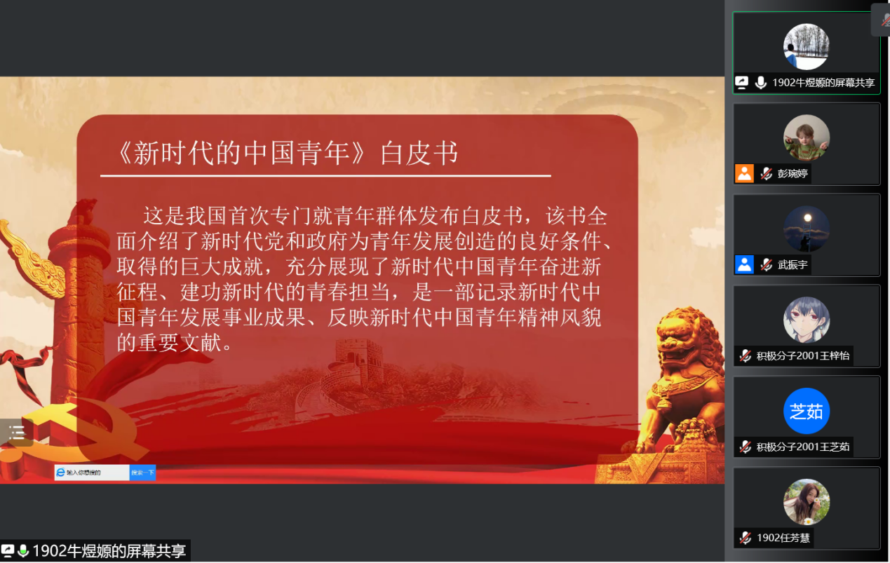 “学雷锋,送温暖”小组学生党支部在腾讯会议开展《新时代的中国青年》白皮书与《中国共产党组织建设一百年》第十六章专题学习。活动由支部副书记武振宇主持,支部全体党员和入党积极分子参加。学生党员曹颖同志与牛煜嫄同志担任主讲人。