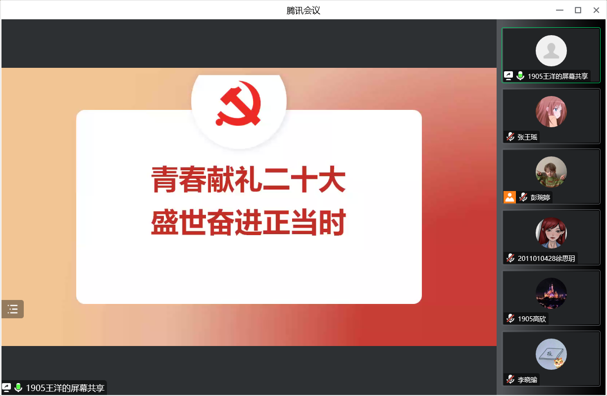 “学雷锋,送温暖”小组学生党支部线上开展“青春献礼二十大,盛世奋进正当时”主题党日活动。会议由彭琬婷主持,支部全体党员和入党积极分子参加。学生党员王洋同志与曹颖同志担任主讲人。