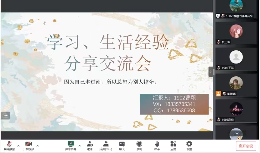 曹颖同志从学习经验、创新科研、生活经验三个方面分享自己的经验。她结合自身实践,向同志们提出以下五点建议:一是要重视、享受每一门课程;二是要养成良好的学习习惯、端正学习态度;三是要奠定良好的专业基础;四是寻找喜欢的专业方向,五是要积极参加竞赛,及时与老师交流。