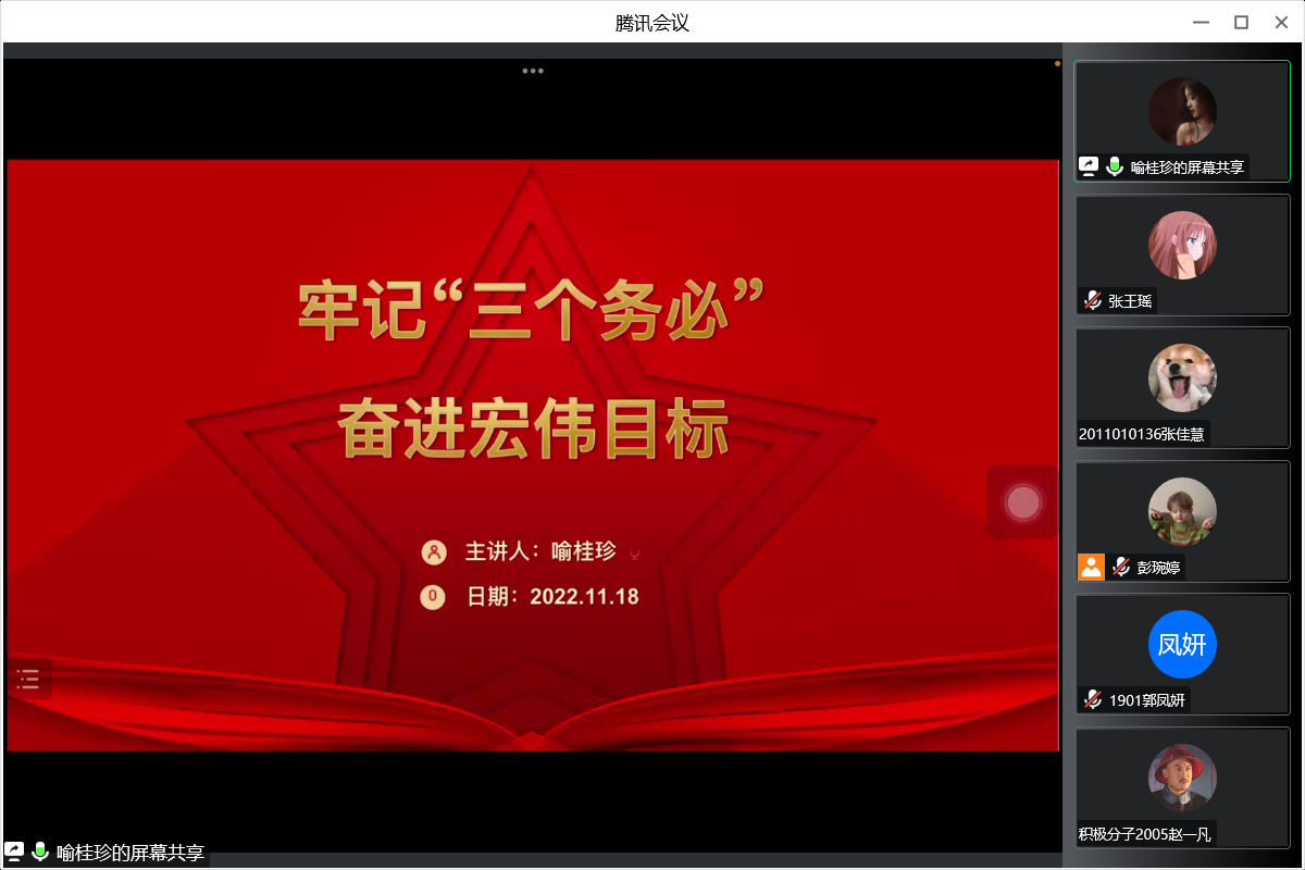 “学雷锋,送温暖”小组学生党支部线上“牢记‘三个务必’,奋进宏伟目标”主题党日活动。会议由彭琬婷主持,支部全体党员和入党积极分子参加。学生党员喻桂珍同志担任主讲人。