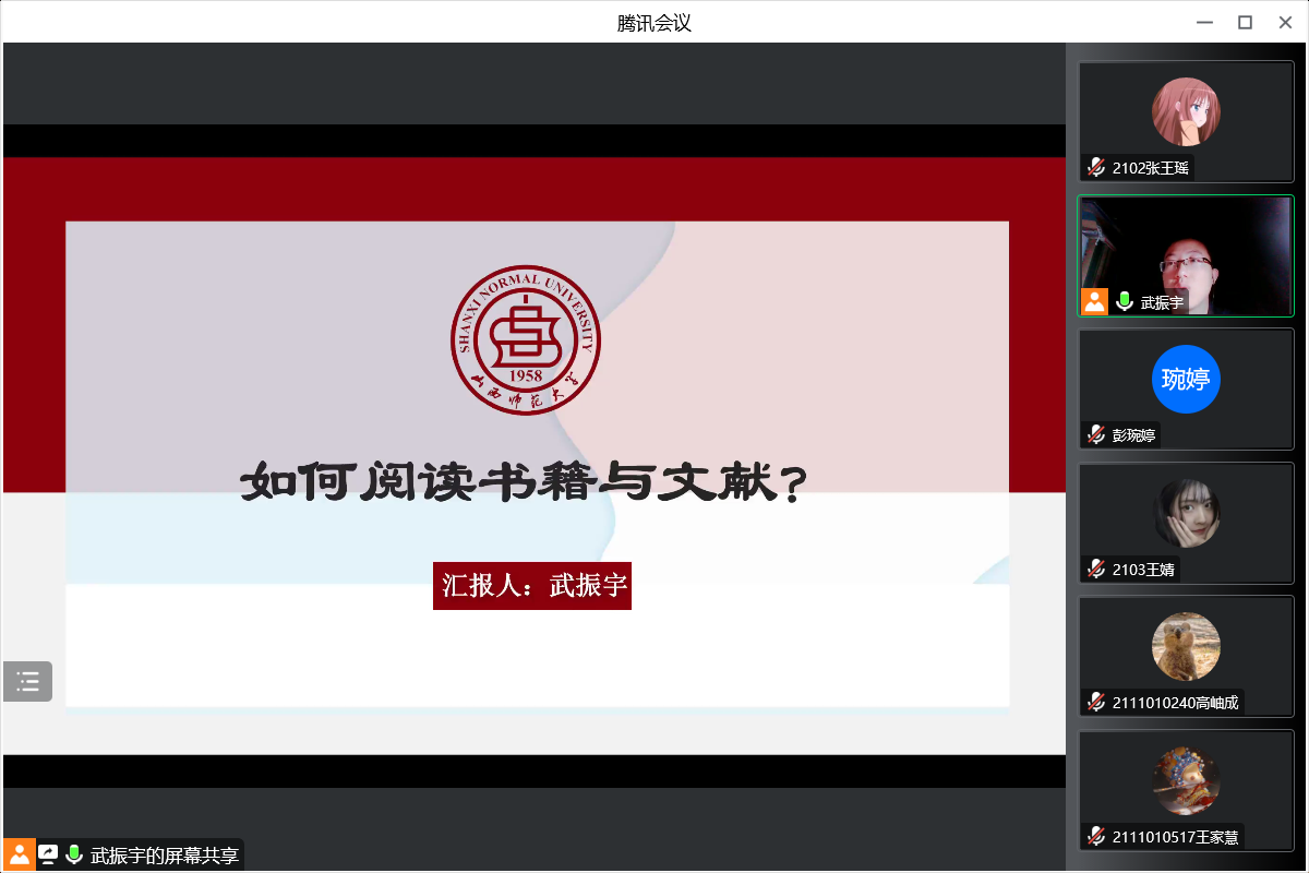 武振宇同志以《戴东原集·与是仲明论学书》为切入点,从什么是文献、如何寻找文献、如何阅读文献三方面详细讲解了如何阅读文献与书籍。他以《论语·八佾》、《说文解字》以及各朝代对文献的注解说明何为文献,从纸质文献、电子文献和田野调查三个角度介绍如何寻找文献。同时,他结合自身学习经验和”学雷锋,送温暖“小组的具体活动实例,带领支部成员认识到:阅读文献与书籍的根本是掌握读书的方法,材料的占有将决定写作的广度和深度。