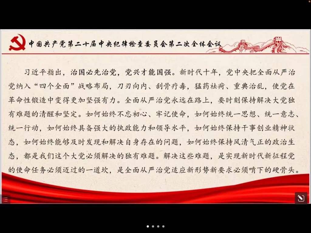 研究生党支部线上召开会议,深入学习习近平总书记在二十届中央纪委二次全会的重要讲话。本次会议由支部书记苏晓慧主持,支部党员王佳琪、岳可彬主讲,全体党员参加。