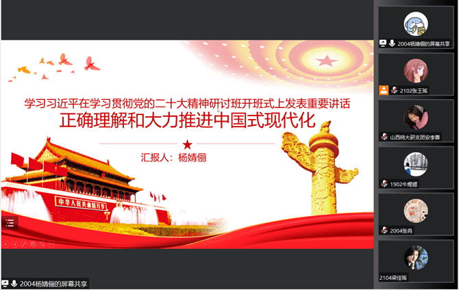 “学雷锋,送温暖”小组学生党支部线上开展“正确理解和大力推进中国式现代化”主题党日活动。会议由支部书记安李蓉主持,支部全体党员参加。学生党员杨婧俪同志担任主讲人。