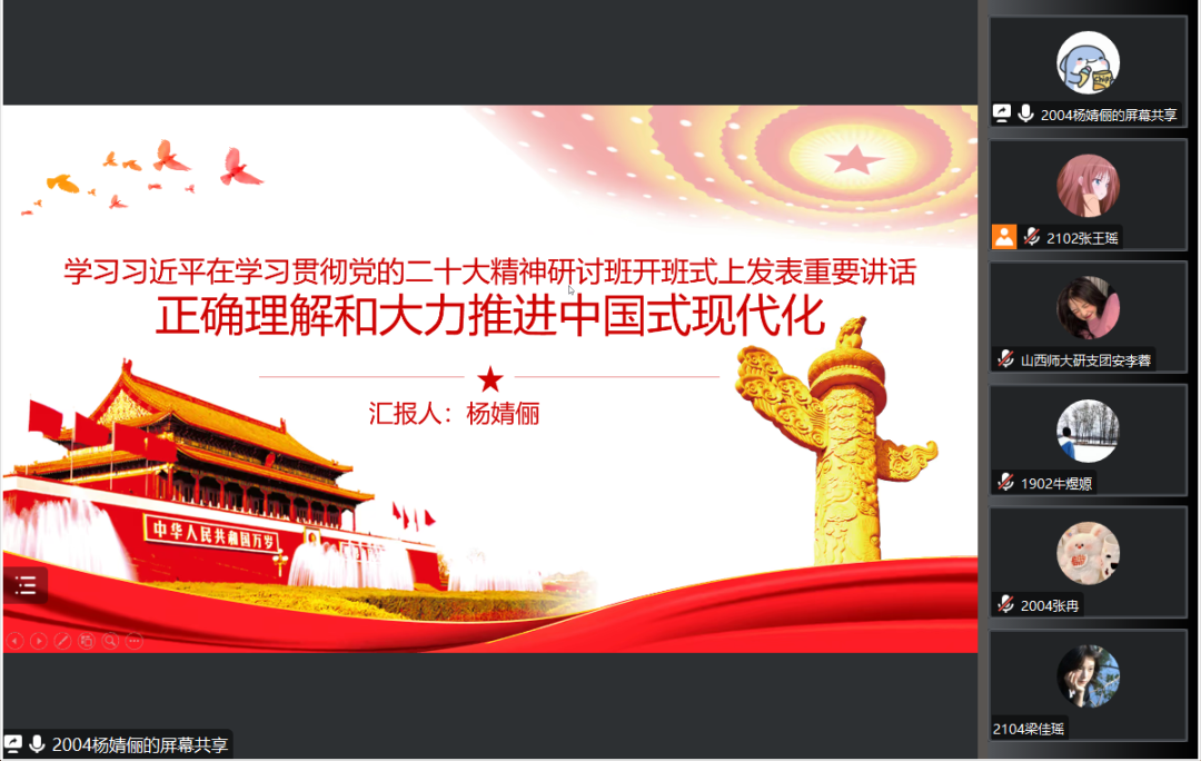 “学雷锋,送温暖”小组学生党支部于线上开展“正确理解和大力推进中国式现代化”主题党日活动。会议由支部书记安李蓉主持,支部全体党员参加。学生党员杨婧俪同志担任主讲人。