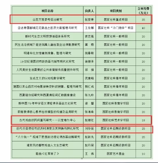 获批国家级人文社科类项目3项:分别为赵变亲教授的项目《山西方言参考语法研究》获“国家社科重点项目”;赵继红副教授的项目《古代戏曲的民间重写研究——以宝卷为中心》获“国家社科艺术学项目”;刘华丽博士的项目《近代汉语使役句的历时演变及其转换与转化研究》获“国家社科后期资助项目”。