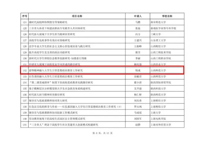 辅导员钱成主持的项目《雷锋精神融入大学生日常思想政治教育工作研究》成功入选。