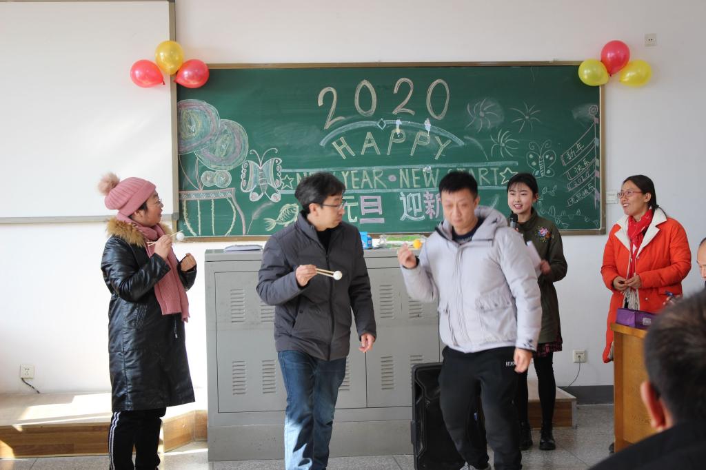 这一年的工作成绩,祝愿全体教师新年快乐,活跃了现场气氛。在游戏环节,老师们热情参与,互相合作。通过“交头接耳” “你做我猜” “夹乒乓球比赛”三个游戏,联欢会的气氛被推向了高潮。在自由活动环节中,真人漫画
