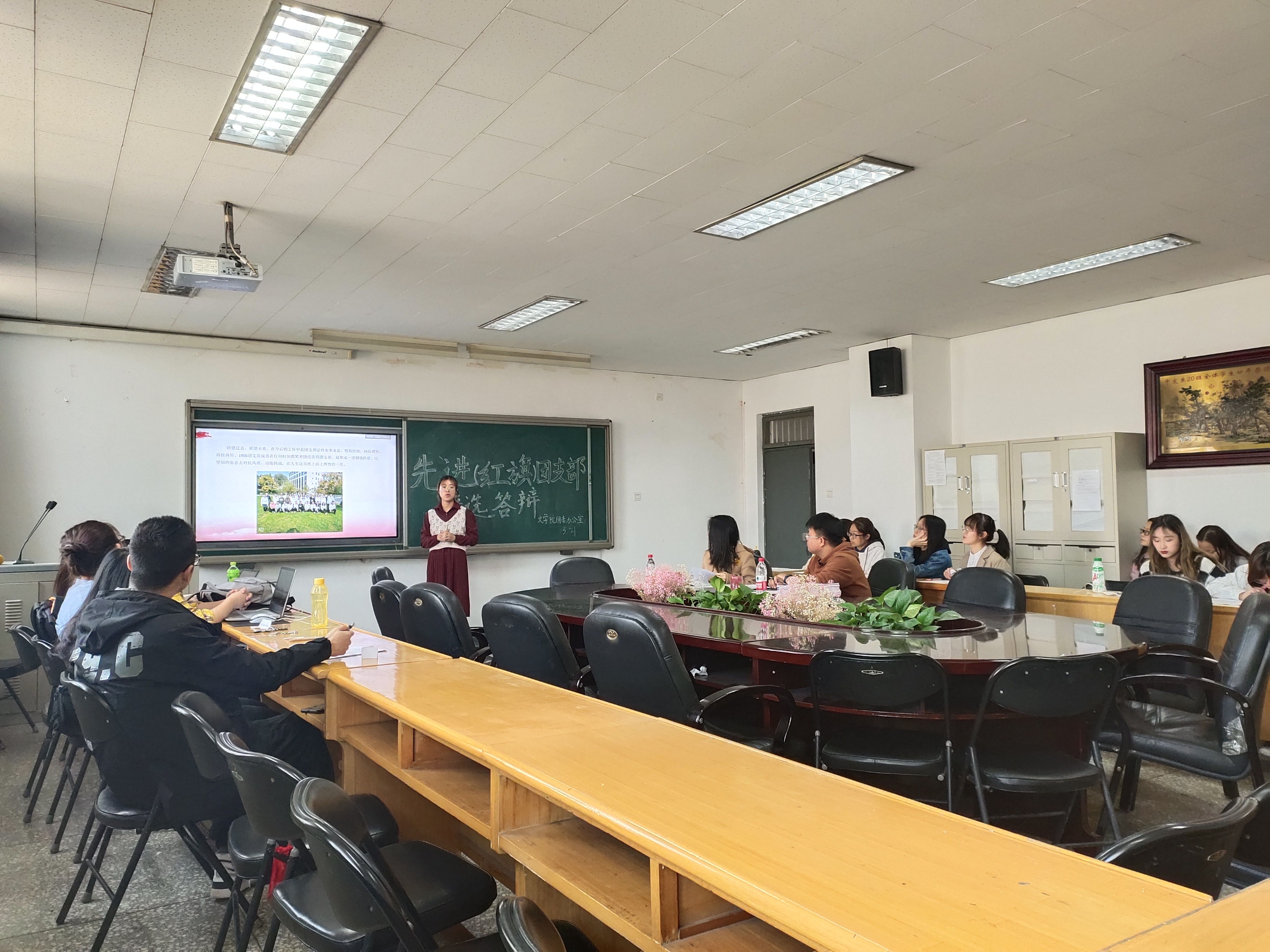 于学院会议室举办先进(红旗)团支部评选答辩。各班团支部书记参加,真人漫画