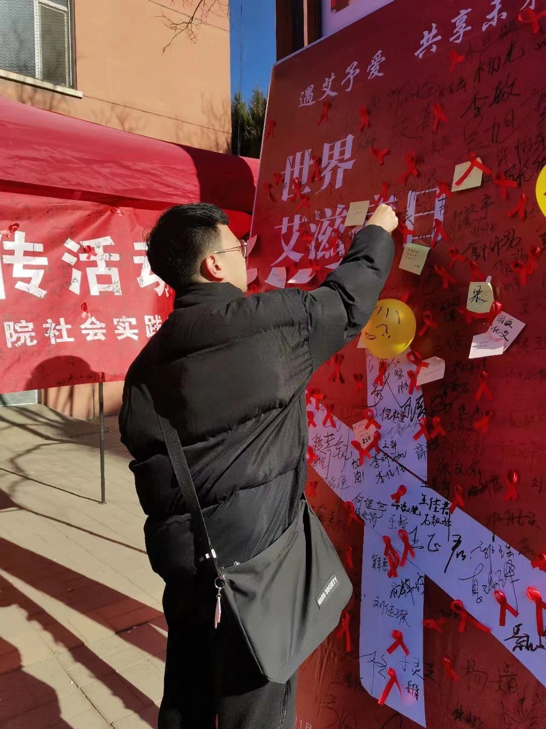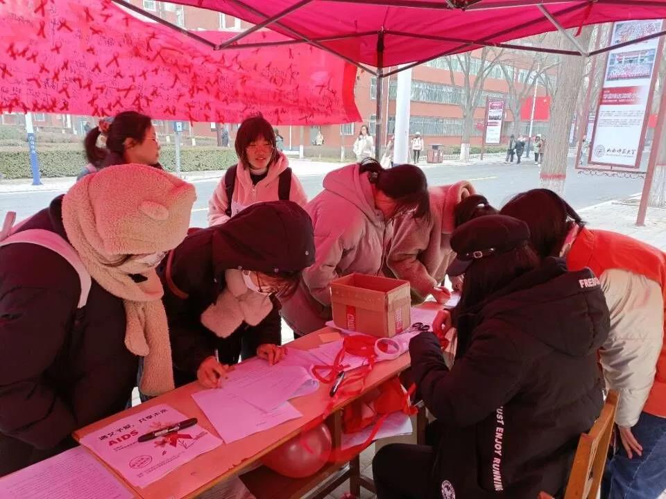 防艾宣传活动在志愿者的组织下有序地进行。在活动中,志愿者们分发了防艾倡议书,并带领参与活动的同学们填写调查问卷、自制红丝带和在防艾横幅上签名。红丝带是艾滋病防治的象征,它们飘扬在校园里,表达着同学们珍爱生命,远离艾滋的决心。