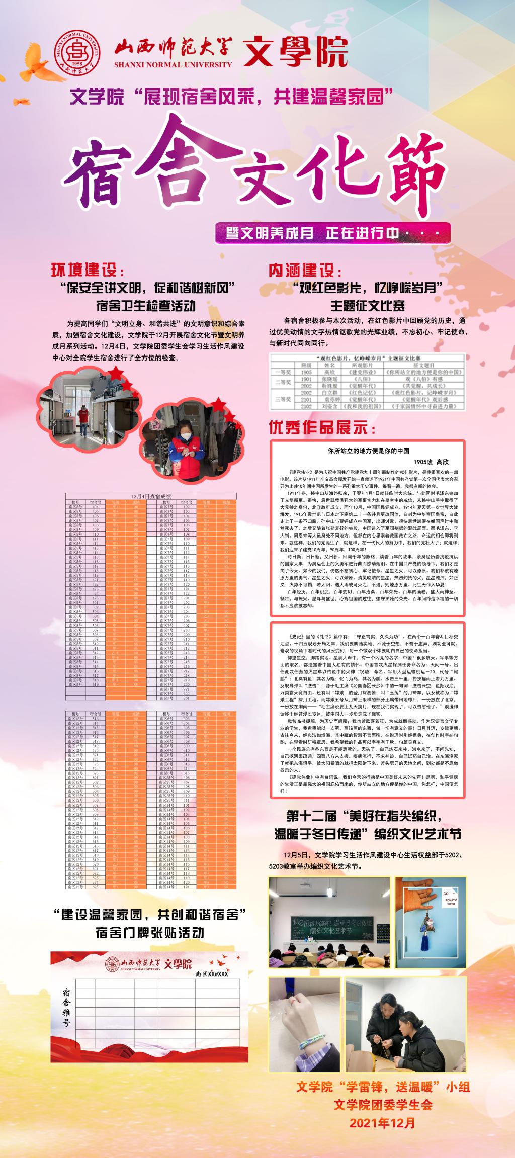 于12月开展宿舍文化节暨文明养成月系列活动。在文明养成月系列活动之“观红色影片,忆峥嵘岁月”主题征文比赛中,共收到学生参赛作品238份,经层层评审,共评选出6份获奖作品。其中,一等奖作品《你所站立的地方便是你的中国》已刊于2号楼门口的展板。