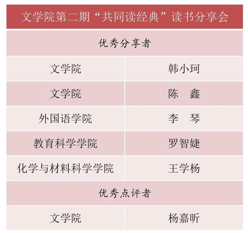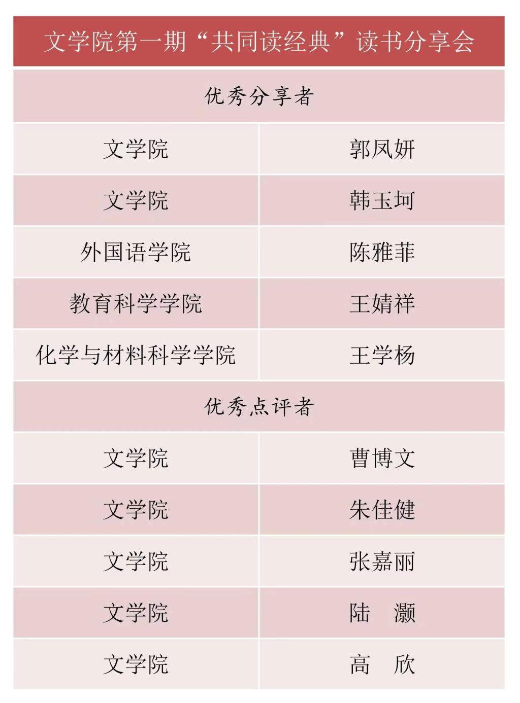 在学院领导和老师的支持下,由红烛文学社主办的“共同读经典”读书分享会开始于2021年12月初,活动采取“线上+线下”相结合的形式,已成功举办两期,390余名同学参加。根据同学们的参与情况和分享内容,两期读书分享会共评选出优秀分享者10人次,优秀点评者6人次。据悉,读书分享会将持续举办,各学院同学均可参加。