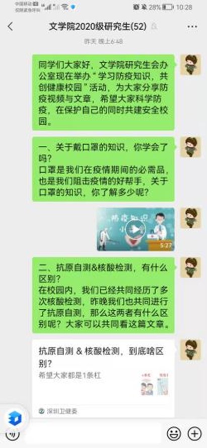 研究生会办公室组织开展了“学习防疫知识,共创健康校园”活动,以线上学习的方式分享了抗疫视频与文章。本次活动在全部研究生微信班级群同步开展,全体研究生都参与其中。