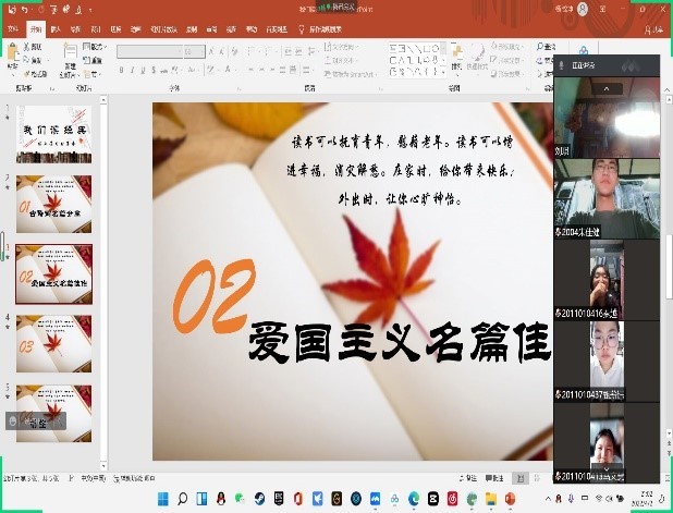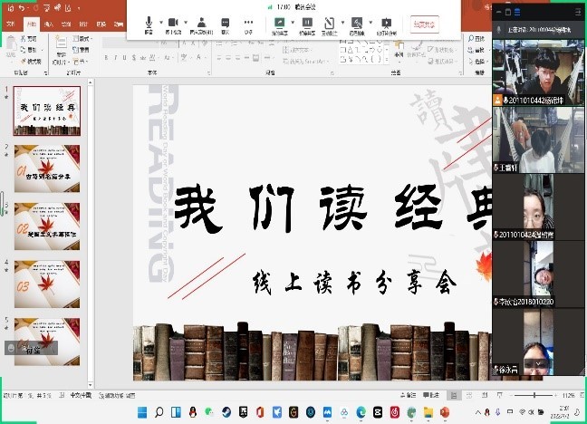 各团支部积极开展线上读书分享会,朗读习近平总书记经典讲话、抗击疫情优秀报道、爱国主义名篇佳作、古诗词名篇等,引导学生在读书与思考当中厚植爱国主义情怀,提升修养,涵育理性平和的心境品格。