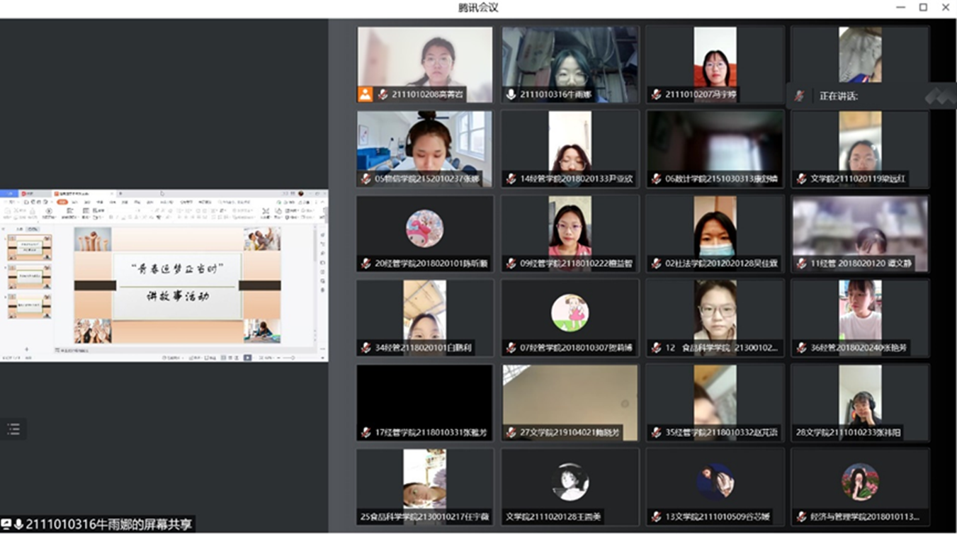 团委学生会社会实践中心心理健康部与神舟诗社于线上携手合办“青春逐梦正当时”讲故事活动。五十余位同学参与会议。