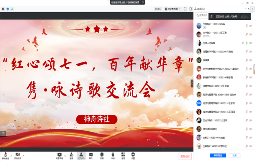 神舟诗社携手团委学生会文礼部及新媒体中心举办线上“红心颂七一,百年献华章”隽·咏诗歌交流会活动。