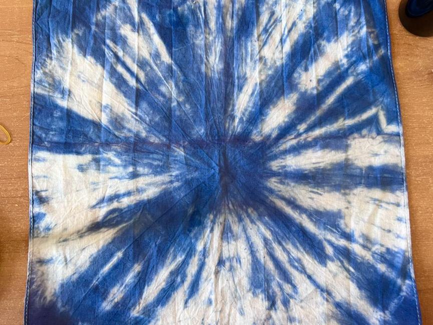 初识扎染,闫老师为孩子们展示了精美的扎染工艺品,带领大家走进扎染的世界。通过讲解扎染历史发展、工具及步骤,孩子们对扎染技艺有了初步了解并产生了浓烈兴趣。扎染环节时,闫老师对扎染的上色技巧和注意事项进行了详细的讲解,并为同学们进行了示范展示,经过扎结、浸染、晾晒等一系列步骤后,一块带有蓝底白花的丝巾呈现在大家面前,孩子们的脸上都露出惊喜的表情并发出一片赞叹之声。在闫老师的积极鼓动下,孩子们动手进行操作,他们组合打水、配置染料,将奇思妙想绘制在布条里,孩子们的自我个性在扎染的纹样图案中得到了充分的释放和表达。课程最后,同学们迫不及待地展示各自的扎染作品并相互交流扎染方法与心得,整堂课弥漫着孩子们浓厚的创作热情和欢快的笑声。