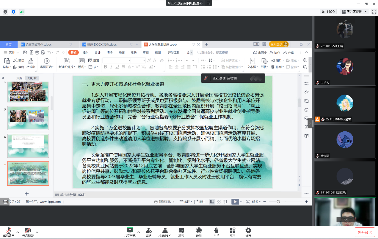 会议伊始,吕树明老师带领大家详细解读了教育部发布的《关于做好2023届全国普通高校毕业生就业创业工作的通知》,他强调当前疫情形势严峻,就业情况不容乐观,同学们一定要确立正确就业观念,不断提高自身综合实力。他以2020届和2021届毕业生毕业去向为切入点向同学们讲解了真人漫画