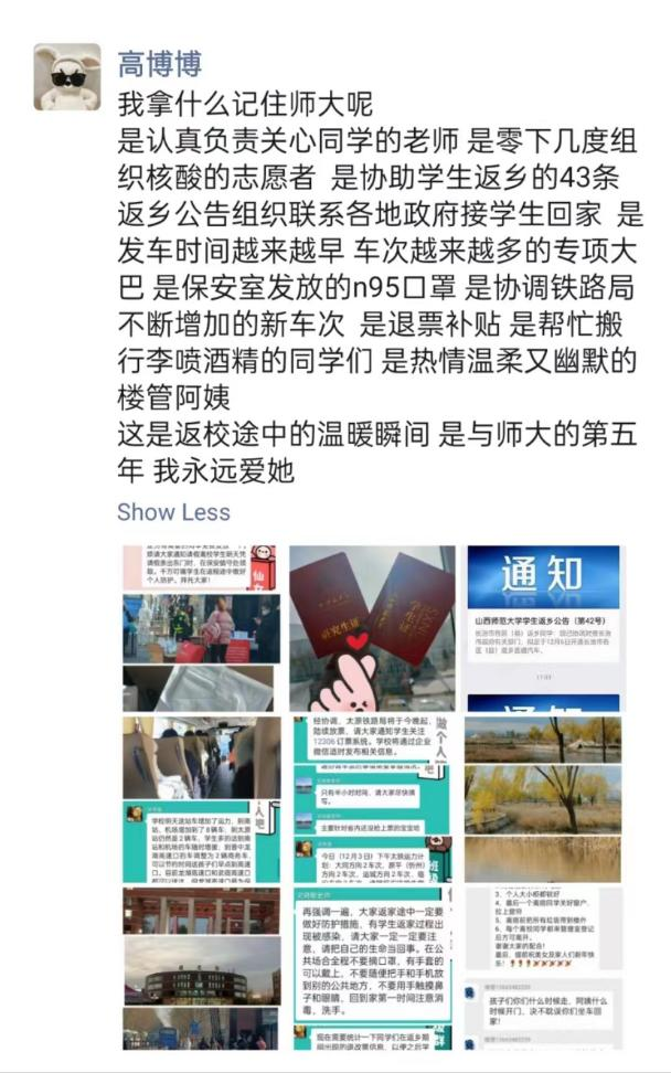 ,保护每位学子的生命安全和身体健康,学校开始着手有序安排学生按批次提前返乡。从进一步优化离校审批手续、组织安排“点对点”送返乡离校同学至动车站点和机场、短短四天内加班加点协助学生返家的43条公告、到学校暖心为每一位离校学子发放N95口罩……师大有条不紊的实际行动在寒冬中温暖着每一位归家学子之心,为表达对学校的感激之情,语言文艺及民俗学研究生党支部开展了“我给学校的一封信”活动,以纯朴的文字向学校表达深深的爱。