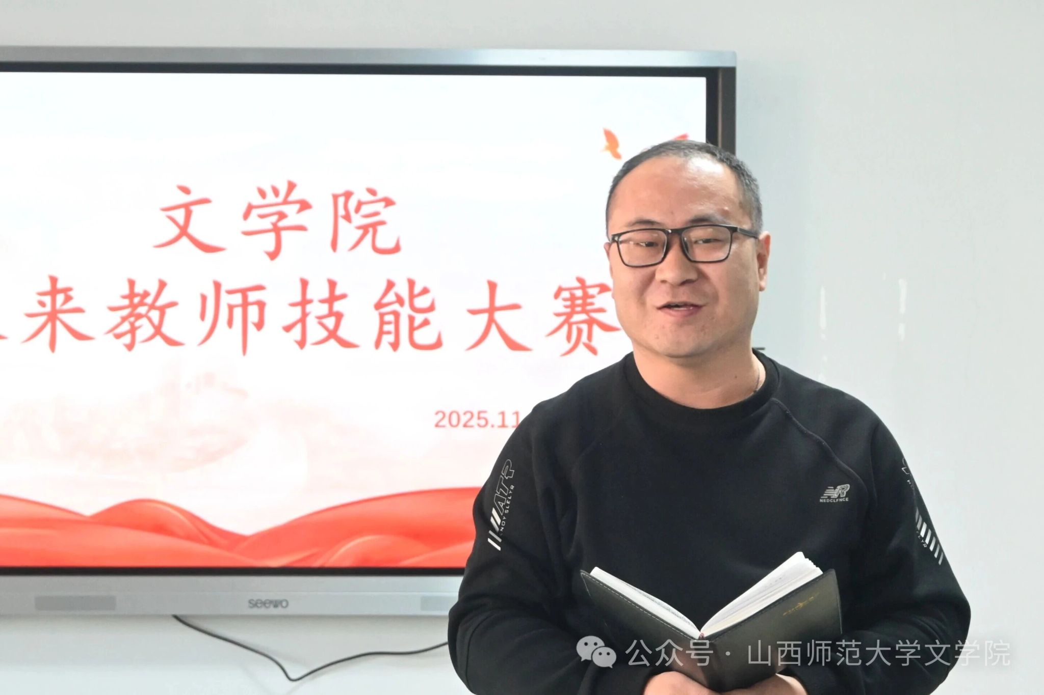 在模拟授课环节,选手们围绕《大战中的插曲》《中国人民站起来了》《长征胜利万岁》《别了,“不列颠尼亚”》等经典课文展开教学展示,他们或激情洋溢地引导学生探究文本深意,或循循善诱地解析语言特色,充分体现了扎实的学科功底与课堂驾驭能力。答辩环节中,评委们围绕教学目标设定、教材分析深度、板书设计意图及单元整体联系等关键问题展开提问,选手们结合教育理论与文本特点,针对教学理念与设计思路两方面进行深入阐释,展现出文院学子对教师职业的深刻理解。此次大赛有效践行了“以赛促练、以评促学”的育人理念,助力学生打磨教学技艺、提升职业素养,为培养时代新人积蓄力量。