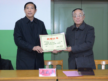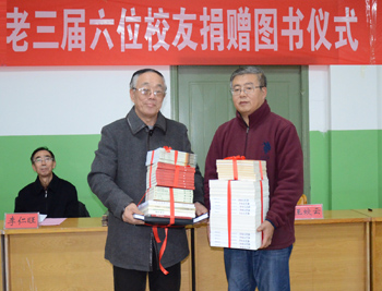 王蛟云校友代表常四龙、贾圪堆、裴步高、辛长青、崔江荣等几位老三届校友向我校图书馆、真人漫画