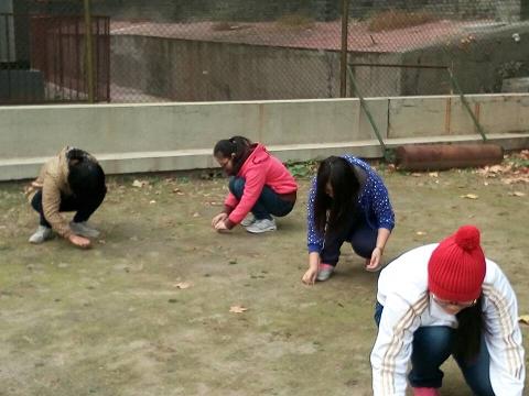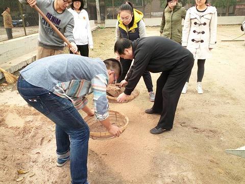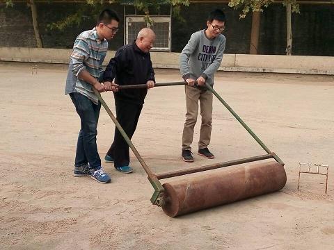 第一项任务是拔草。门球场里面的草低矮且繁密,清理难度较大,拔草后指甲缝里便会挤满沙子。但志愿者们不怕脏乱,不畏辛苦,充分发挥聪明才智,想出用小刀割草的创新方式,成功地克服这一困难。拔完草,接下来的筛沙子是个体力活儿。原本干燥的沙子,经过雨水的浸湿变得沉重。志愿者们分工协作,铁锹铲沙,筛子筛沙,倾倒石子,互相配合,有条不紊,一条完整的“生产线”就这样诞生了。筛好的沙子被铺在已经清理干净的门球场上。张老师推来一个石碾,耐心传授两位志愿者碾压场地的技巧,并在旁边协助便于及时给予指导。