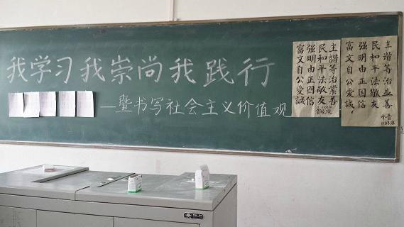 1103班将理论学习与书法相结合,活动最后的“书写我情怀”环节既达到了学习社会主义核心价值观的目的,又与学院特色结合,达到了全班同学的参与力度。