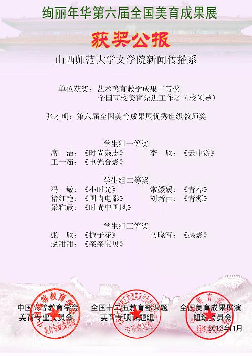 新闻传播系荣获“艺术美育教学成果二等奖”;张才明老师荣获“第六届全国美育成果展优秀组织教师奖”;席洁(1004班)、李欣(1006班)、王一茹(1006班)三位同学荣获学生组一等奖;冯敏(1004班)、常媛媛(1004班)、褚红艳(1004班)、刘新苗(1006班)、景雅晨(1006班)等五位同学荣获学生组二等奖;张欣(1006班)、马晓霄(1004班)、赵甜甜(1006班)等三位同学荣获学生组三等奖,为山西师大、为真人漫画