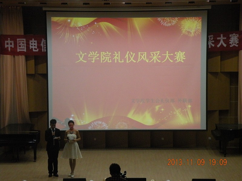 晚7点,师大音乐厅灯火辉煌,主持人宣布礼仪风采大赛正式开始。比赛共分为自我介绍、知书答礼、服装T台秀、个人才艺展示4个环节。礼仪部全体成员进行开场舞表演后,八位参赛选手以幻灯片为辅助分别作了自我介绍,并进入“知书答礼”环节,依次进行自主选题做答,此环节旨在考察她们对于基本文明礼仪知识的掌握程度。在个人才艺展示环节,八位选手分别进行了她们的才艺表演。她们的节目,形式多样,表演精彩,获得观众的阵阵欢呼与喝彩。“服装T台秀”是此次大赛的一大亮点,选手们身着各种风格的礼服,伴随音乐在台上尽情展现自己的风采,她们的精彩表现再次引发了热烈的掌声。大赛还特别设置了现场抽取幸运观众环节,每个抽奖环节都有三位幸运观众获得师大电信提供的礼品,有效的增强了与观众的互动,活跃了现场气氛。此外,比赛过程中还穿插了外联部的精彩小品《新闻联播之外联特写》,以及电信营业厅选送的学生个人演唱《两地曲》、迈克尔杰克逊的激情舞蹈等节目。