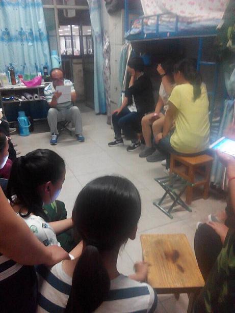 1503、1504班辅导员鲁立智老师向同学们讲述自己年轻时的军训经历,关切询问各宿舍新生的身体状况,提醒他们要按时作息。鲁老师还告诉大家应当正确处理学习与学生会和社团工作的关系,可积极参与但应当做好协调。