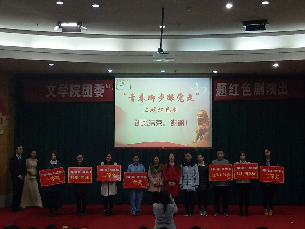 回望激情燃烧的岁月,用赤诚的心曲缅怀革命先驱不朽的足迹;聆听红色经典的温馨,用仰慕的情怀感受历史蕴含的感动,这是朗诵节目—《红色江河》向我们传达的情怀;忆当年,一艘南湖上的红船从黎明中驶来;看今朝,共产党带领人民谱写了挥洒热血、艰苦创业、坚持发展的壮丽篇章。九十五年的栉风沐雨,从奴役到解放,从贫穷向富强!没有共产党就没有新中国,这是1607班以《中国共产党的成立》这一剧目对中国共产党的致敬;红军战士永远不会倒下,父老百姓永远在殷殷期盼。他们的斗志永不会被磨灭,只因身后有着千千万万的百姓,1603班的《渺渺赤水漾情花》传达了红军战士与乡亲父老的浓浓鱼水情;从风雨飘摇的嘉兴南湖,到危机四伏的遵义古城;从灯影摇曳的延安窑洞,到红旗招展的人民大会堂……九十五年的天地沧桑,九十五年的风雨前行,九十五年来,中国共产党领导中国革命,不断从一个胜利走向另一个胜利,一段精彩的琵琶伴舞《唱支山歌给党听》唤起了我们多少幸福、美好的回忆,唤起了我们对革命先烈的缅怀之情;71年前的抗日战争涌现出何其多的英雄人物,他们为我们的民族做出了伟大贡献,已然成为了每个人心中追求的精神和坚贞的信仰,这是1604班的《风声》向我们传达的内容;当锦绣山河遍染了狼烟烽火,当家国天下掺杂了儿女情长,当冲冠一怒的将军兵临城下,当视死如归的巾帼以身殉国……古老的故事有了新的悲欢离合,一种雄壮的力量震撼你我,这是1606班《亮剑》带给我们的战士的坚决与感动!鸭绿江,经历了一段气吞山河的历史,目睹了一个民族捍卫尊严的壮举,谱写了一曲威武雄壮的旋律。如今又过了60年,究竟有多少人还记得“谁是最可爱的人”?又有多少人仍在怀念着那些志愿军战士?1601班的《不忘初心,继续前行》给了我们答案,我们要做的就是从无数共产党人手中接过这份保卫祖国的责任,不忘初心,然后继续前进!明月不谙离别苦,亦难谙离人心系天下的豪情。他成全家国,深深数载,终成国之栋梁!她独守小家,只为他可以安心奉献!这是1602班《家国天下》表达的情怀;当改革的春风吹遍中国大地,处处都是一片崭新的景象,1605班的《小岗村,大举动》带领我们见证了安徽凤阳小岗村的改革过程;有一种花,开在山间,不张扬,不做作,以耀眼的红静静等待黎明的到来;在革命期间,以这种花命名的革命曲目表达了广大人民群众对红军的无限拥戴;伴随着这支耳熟能详的《映山红》在演出现场被唱起,演出也接近了尾声。