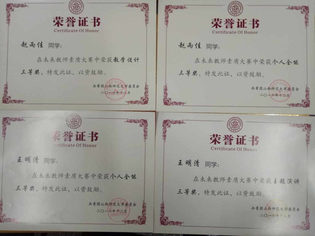 凭借扎实的专业实力及新颖独特的教学风格取得了可喜的成绩,获得团体总积分排名第六名,王明清和赵雨佳同学共同斩获文科组个人全能奖三等奖。此外,王明清同学获得主题演讲单项三等奖和课堂教学单项二等奖,赵雨佳同学获得教学设计单项三等奖和课堂教学单项三等奖。