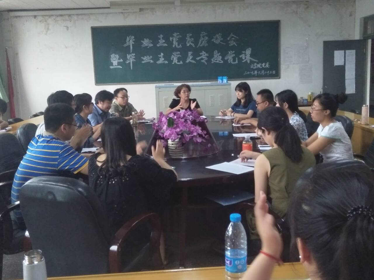 毕业生党员座谈会后,吴华英书记为全院党员讲授了“维护核心见诸行动——学习践行党的十八届六中全会精神”的主题党课,党课从“党的十八届六中全会的重大成果和重大意义”、《准则》和《条例》的主要内容、我们如何以实际行动践行党的十八届六中全会精神三个方面进行了分析和阐述。她希望大家能以十八届六中全会精神为指引树立坚定的理想信念,严格遵守党的法纪,时刻牢记党员身份,在教学、科研、学习和生活等各方面率先垂范,发挥模范带头作用,用实际行动维护党中央权威和习近平总书记的核心地位,用优异成绩为党旗添彩。