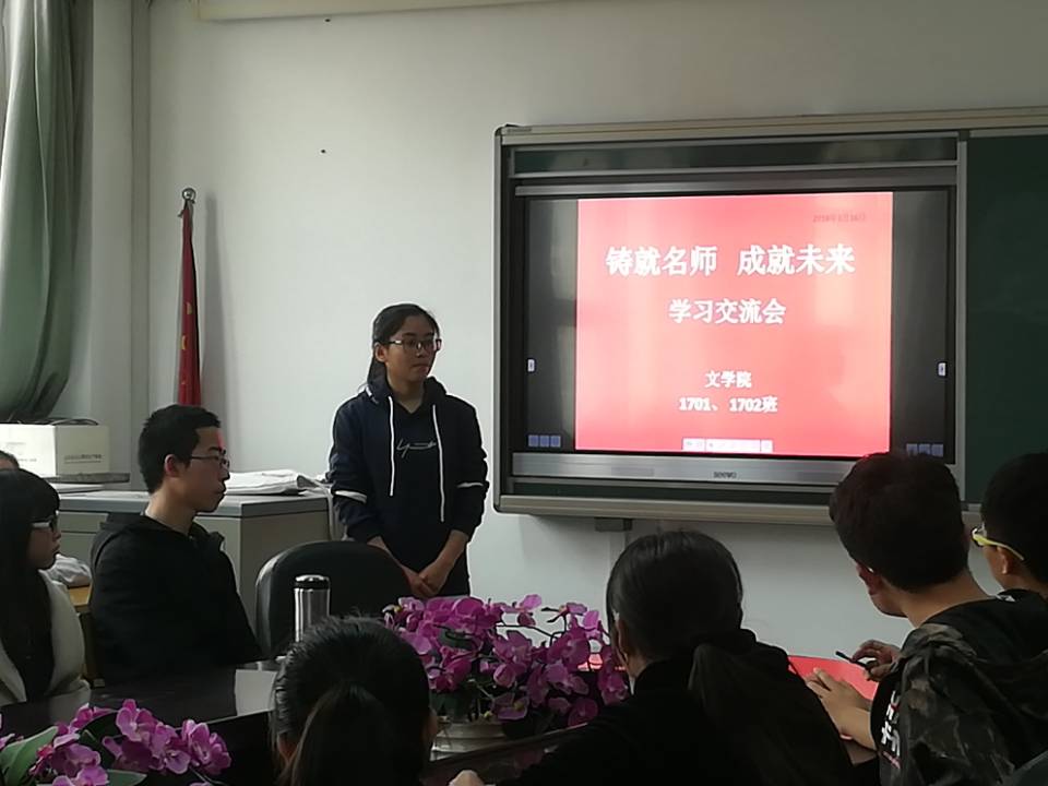 1701、1702班特别邀请获得第五届全国师范生教师技能大赛语文组二等奖的王明清学姐参加了“铸就名师,成就未来”学习经验交流会。