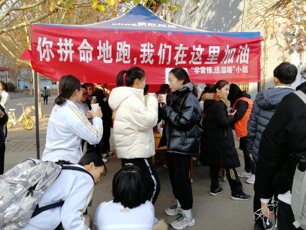 11月26日至30日,“学雷锋,送温暖”小组在操场西侧搭起帐篷,组织了一支长跑后援队,为长跑结束后的同学们提供热水和休息场所,并取得了良好的效果与反响。