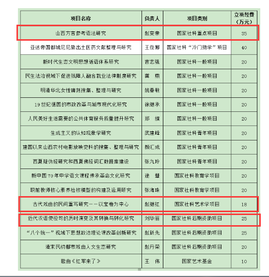 共获批国家社科基金项目3项,赵变亲教授《山西方言参考语法研究》获国家社科重点项目立项;赵继红副教授《古代戏曲的民间重写研究——以宝卷为中心》获国家社科艺术学项目立项;刘华丽博士《近代汉语使役句的历时演变及其转换与转化研究》获国家社科后期资助项目立项。