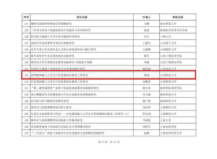 辅导员钱成主持的项目《雷锋精神融入大学生日常思想政治教育工作研究》成功入选。