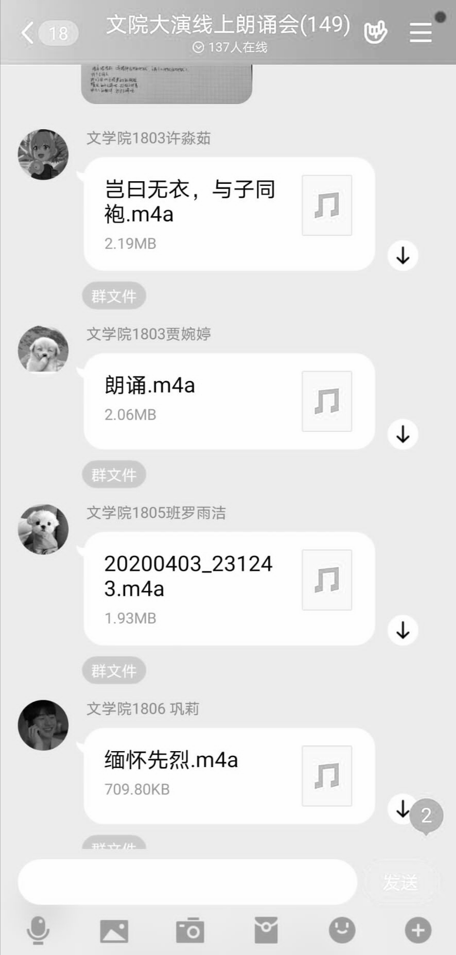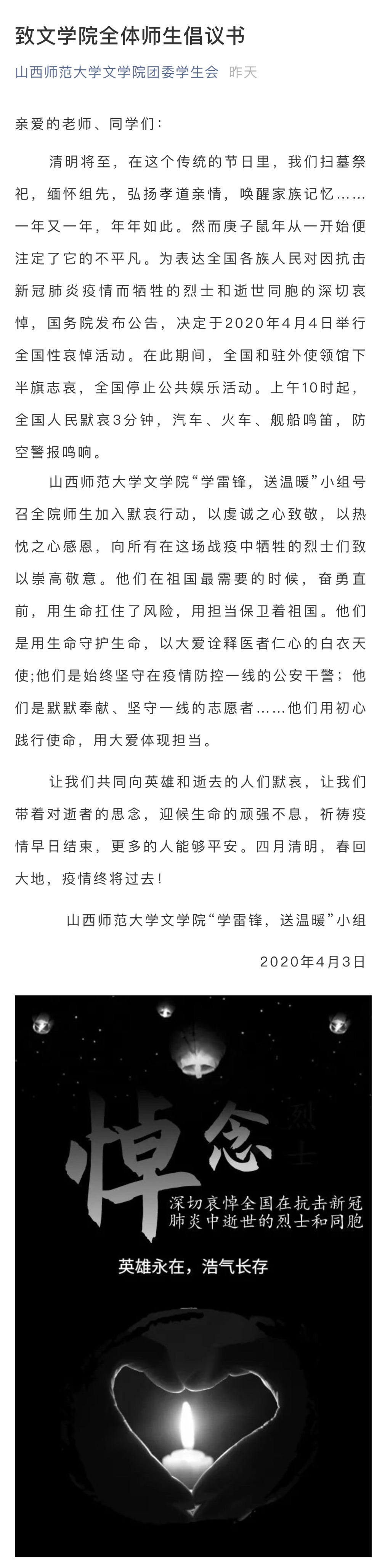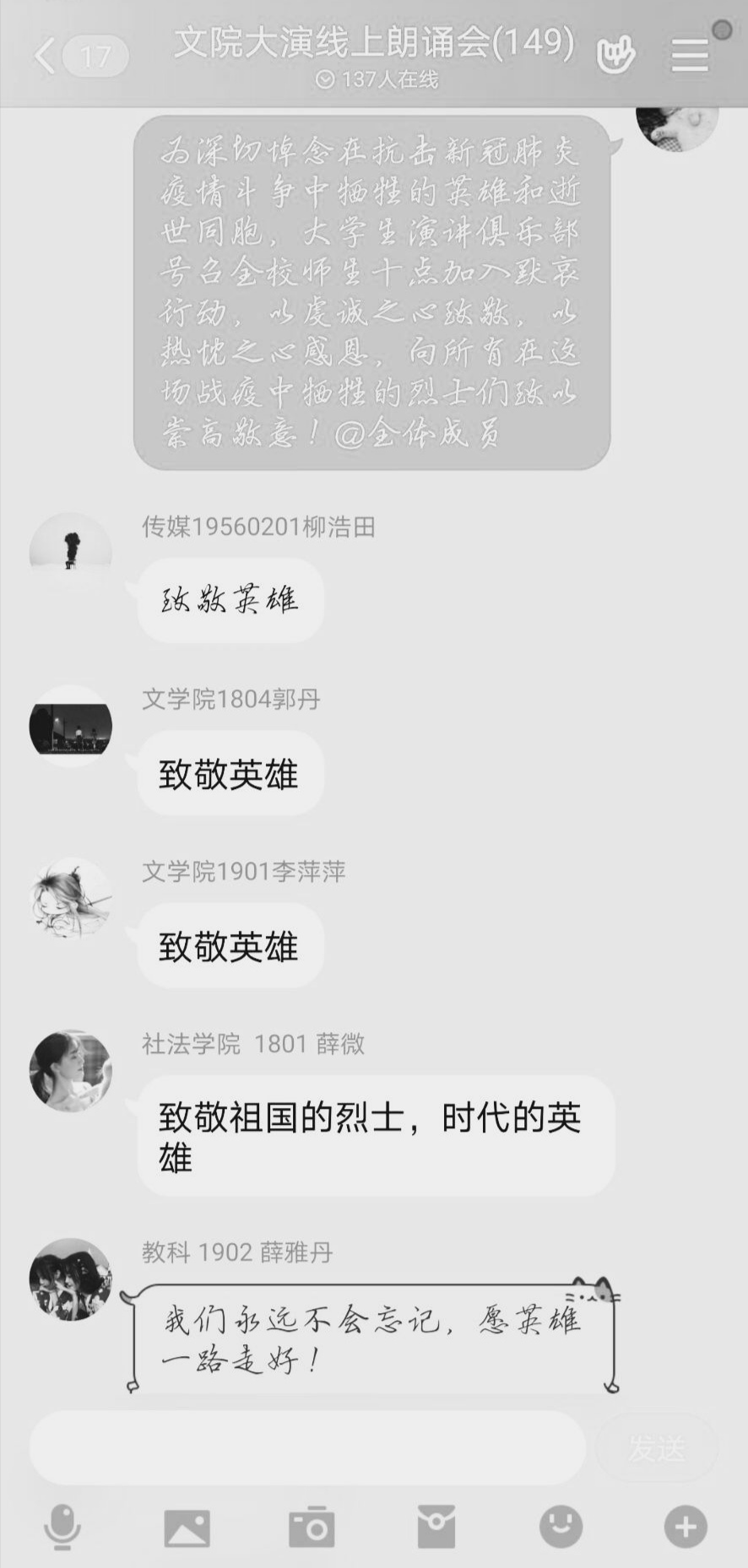 党委和小组的倡议下,上午10时整,全体同学在家立正默哀,为因抗击新型冠状病毒肺炎而牺牲的烈士及逝世同胞哀悼,向英雄们致以崇高敬意与美好祝愿。随后,小组与大学生演讲俱乐部联合开展的线上朗诵会正式开始,同学们纷纷在活动群上传自己的朗诵音频,借音抒情,在这特殊的节日为战疫英雄们送去最朴素的赞礼。