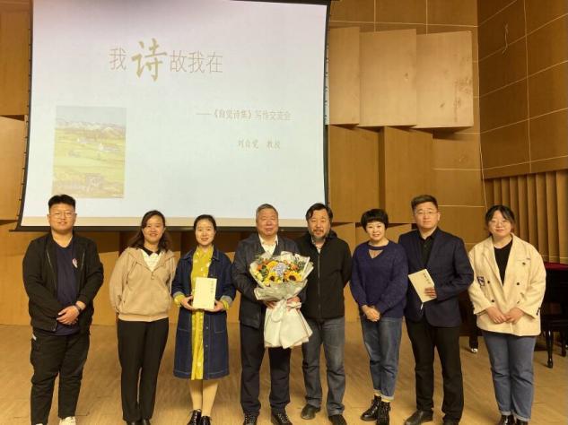 刘自觉教授首先从以自己的名字讲起,他指出所谓“自觉”就是自我觉识与自省,启蒙教化他人,而教育则是一种艺术,是一个灵魂对另一个灵魂的唤醒。其后着重向同学们介绍自己的大山三部曲、小山三部曲、江河三部曲、男人三部曲、花缘五部曲、爱情三部曲、现实三部曲等多首作品。通过对作品的介绍,他提出“写诗三部曲”:首先是写,写诗的过程就是生命存在的过程。其次是诗,诗就是一个人生命存在的结晶。最后是读,当一个诗人的诗被别人记忆和感知时,诗人自身就以诗的形式嵌入别人的灵魂和生命中,并得以持续和趋近于永恒。刘自觉强调自己诗歌创作的主要精神来源来自自己作为农民的儿子、大学教授和中学校长,得益于此,自己的诗歌有着乡土情怀,并且受到山西民歌和生命美学的影响。