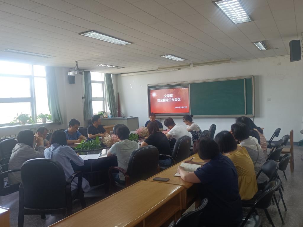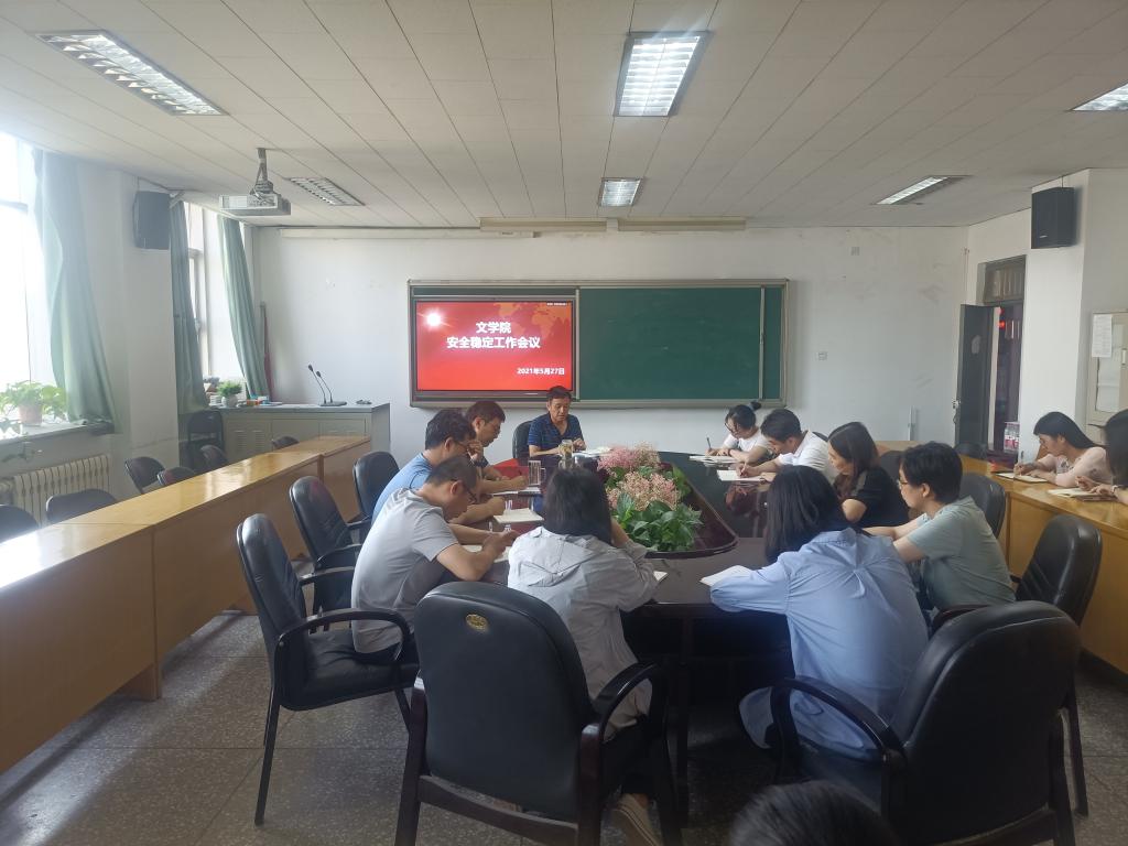于学院会议室召开安全稳定工作会议,全体行政管理人员、学工组成员和辅导员参加,会议由党委书记强汾生主持。