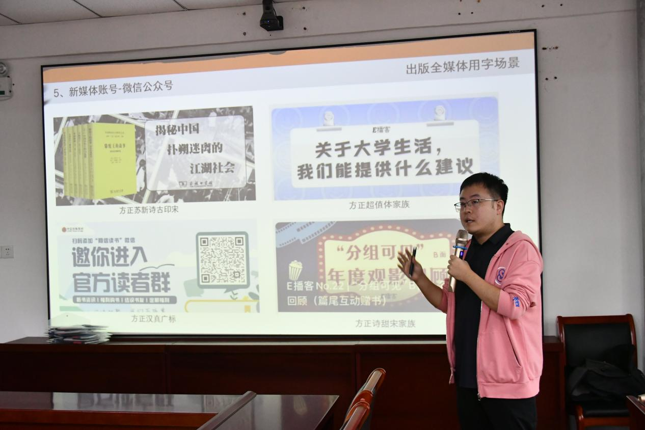 传媒学院副院长、郝建国副教授《马克思主义出版观视阙下党报话语体系的发展和创新——基于<人民日报>的分析》;新京报创刊成员、高级网络营销师张浩淼、北大方正电子产品部总监周循、方正电子院校业务总监陈富豪也作了《出版物新媒体运营经验分享》《出版新媒体用字分享(字由字在系列)》;《交互式出版物策划与制作》等讲座。