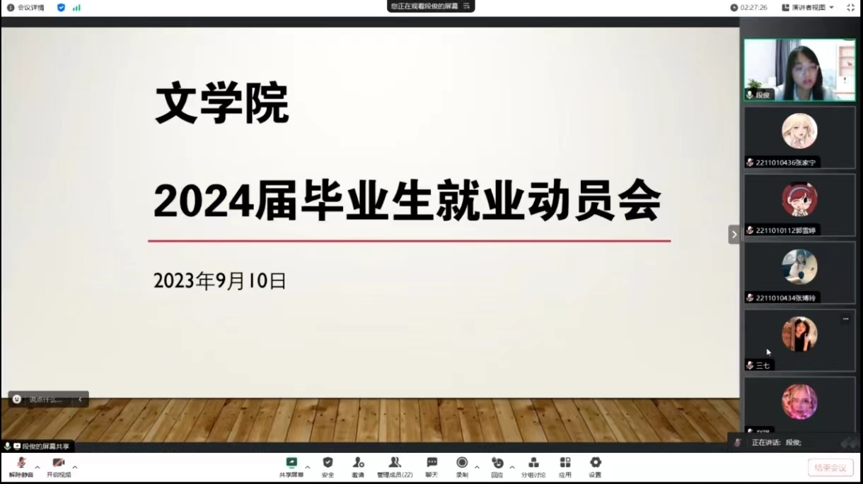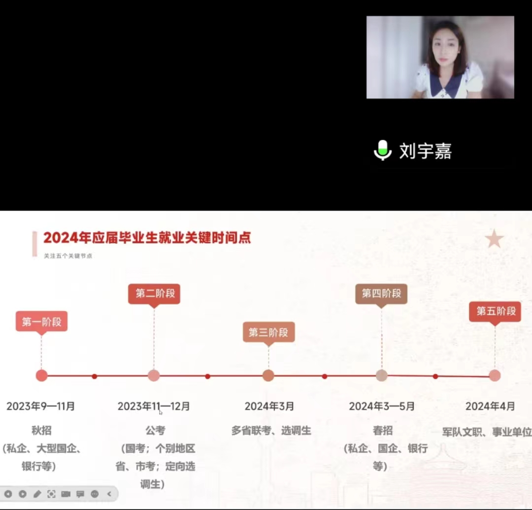 于线上举办2024届毕业生就业动员会。动员会由副院长段俊主持,动员会还邀请2020届本科毕业生刘宇嘉进行学习经验分享分享,全体2024届毕业生参与。