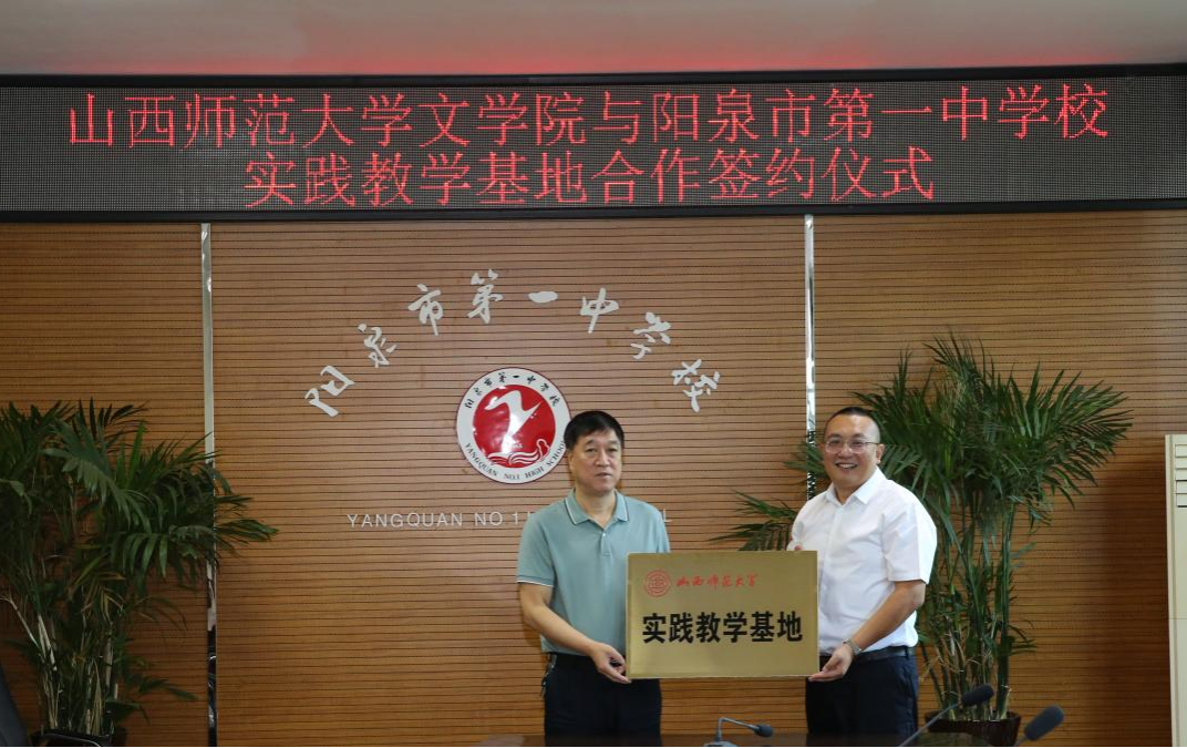 党委书记钱成与阳泉市第一中学校校长史生岗签订了《实践教学基地合作协议》并授予阳泉市第一中学校“实践教学基地”牌匾。